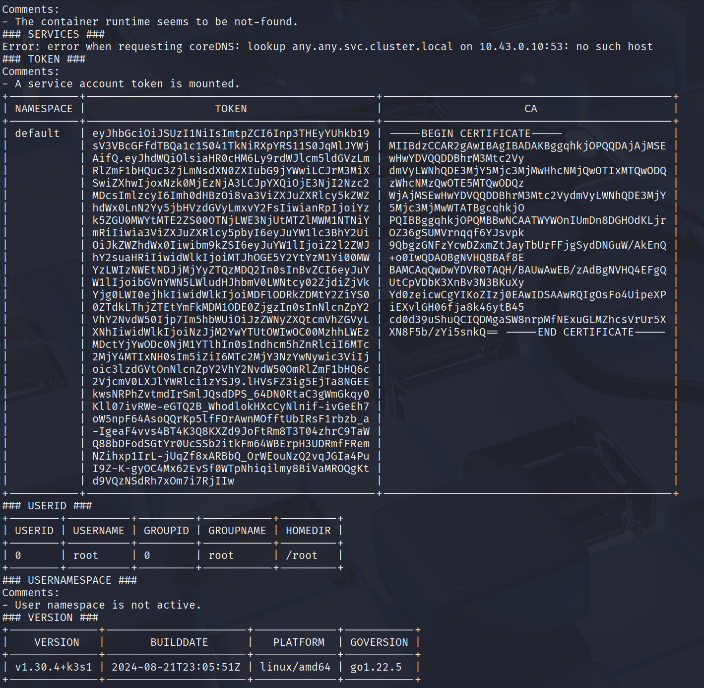 1 2 curl -k -H "Authorization: Bearer $TOKEN " https://$KUBERNETES_SERVICE_HOST :$KUBERNETES_SERVICE_PORT /api/v1/namespaces/default/secrets